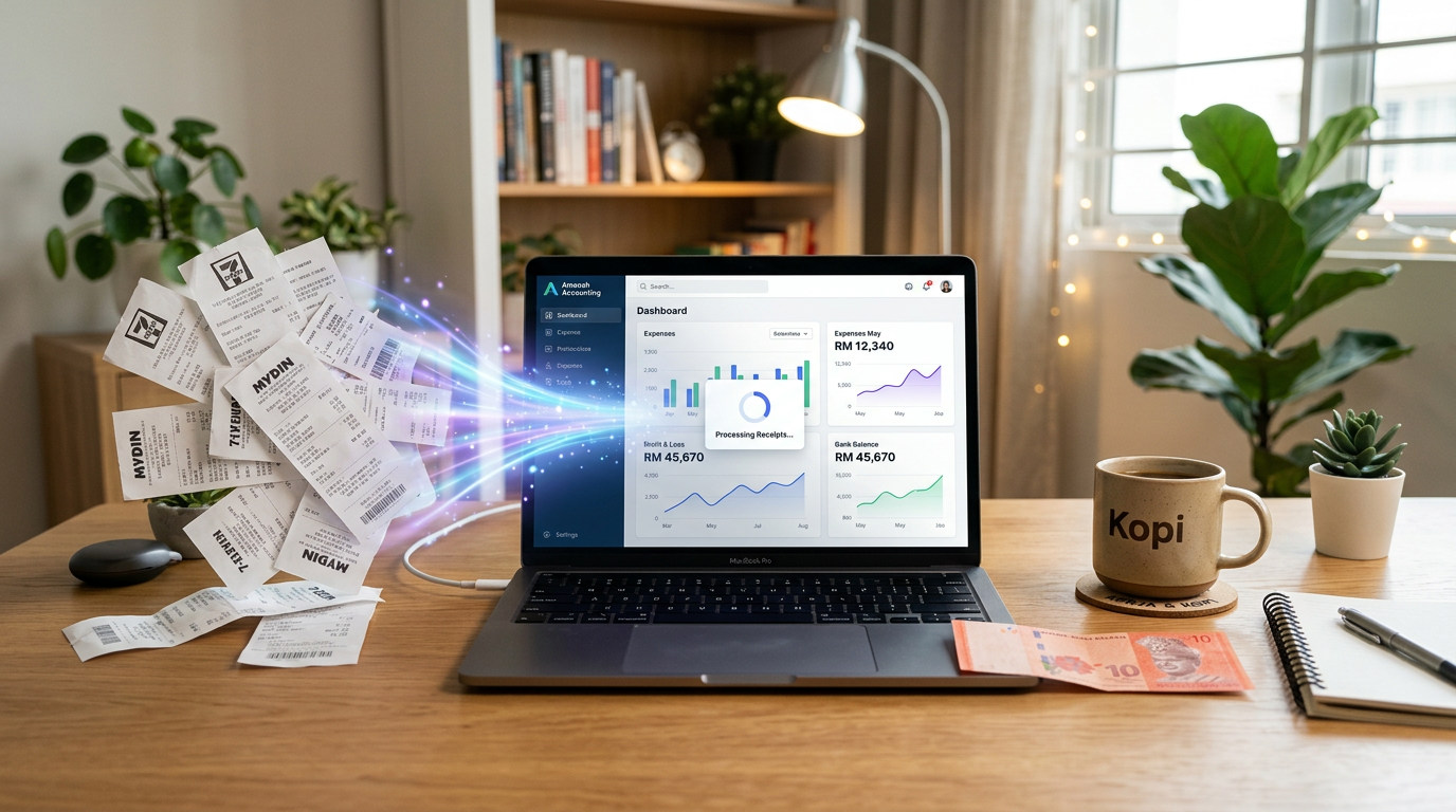 Featured image concept: A warm, modern workspace desk with a laptop showing a clean accounting dashboard, a small stack of receipts being "absorbed" into the screen by a soft blue AI glow, with a Malaysian ringgit note and a coffee cup in the background.