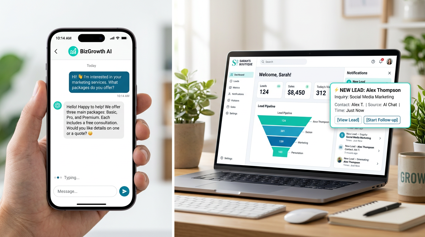 Featured image concept: Clean split-screen — left shows a phone screen with a friendly AI chat conversation in progress (question about services, instant helpful reply), right shows a small business dashboard with a new lead notification. Bright, modern design with subtle brand colours.