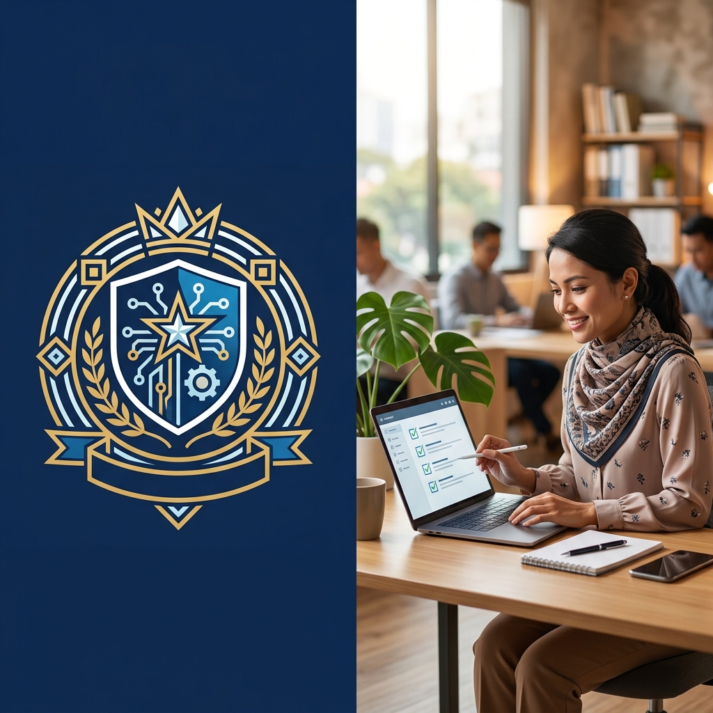 Featured image concept: A clean, professional split composition — left side shows the MY-AI standards logo and Malaysian government seal against a navy blue background, right side shows an SMB owner at a desk reviewing a simple checklist on a laptop. Warm office lighting. No text overlay needed.