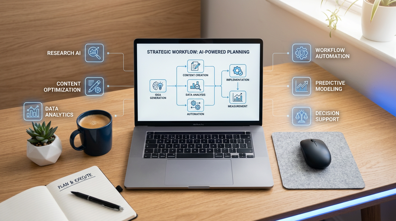 Featured image concept: A clean, modern workspace desk viewed from above with a laptop showing a simple flowchart or strategy diagram, surrounded by minimalist icons representing connected AI tools — conveying planning and intentionality rather than chaos. Warm lighting with blue accent tones.